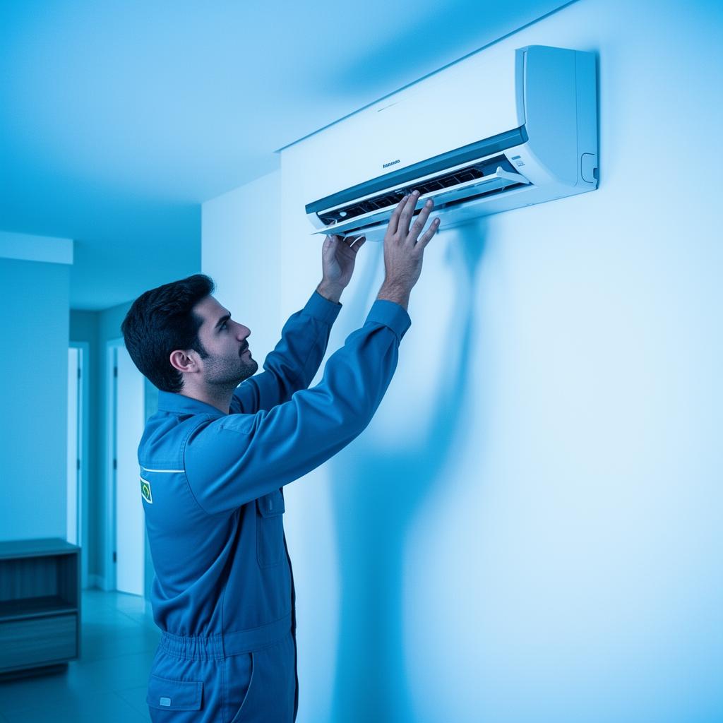 Instalação profissional de ar condicionado split com tubulação dimensionada e teste completo de funcionamento.